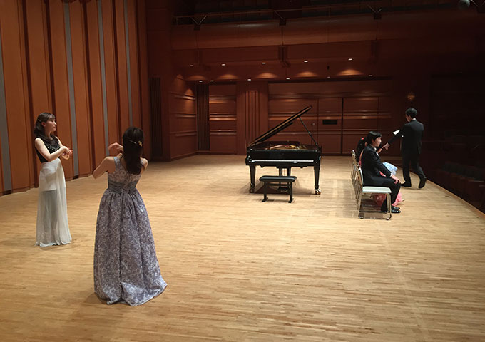 本番前に当日リハーサルは3回あって、1回は小さな楽屋のアップライトピアノで、1回は大きな楽屋のグランドピアノ、もう1回はステージとなっています。